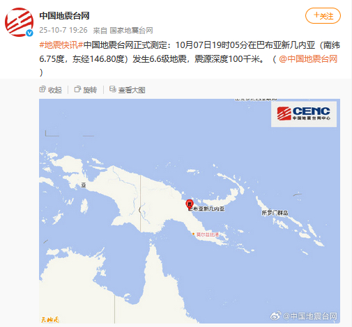 :中国地震台网正式测定:10月07日19时05分在巴布亚新几内亚(南纬6.75度,东经146.80度)发生6.6级地震,震源深度100千米。